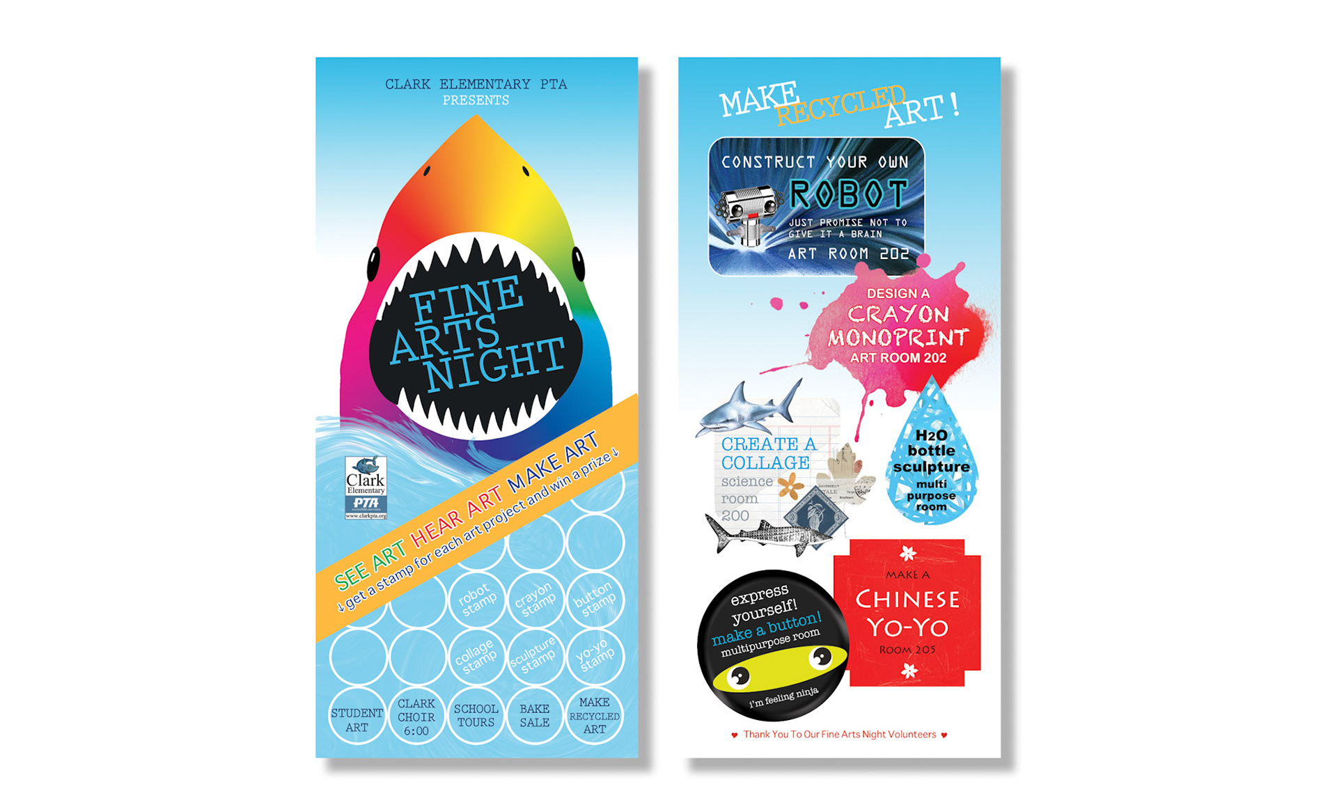 For Fine Arts Night at Clark Elementary, I upped the fun quotient on the program by making it a stamp rally form. And who doesn't love a big rainbow shark?
